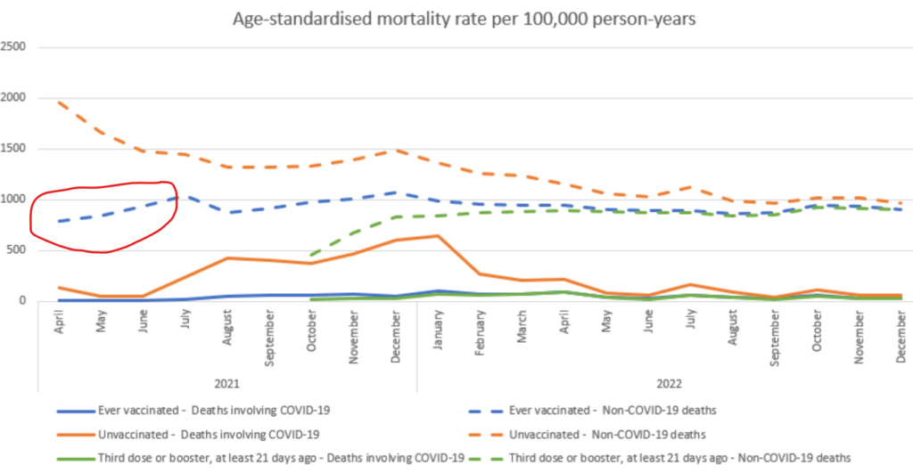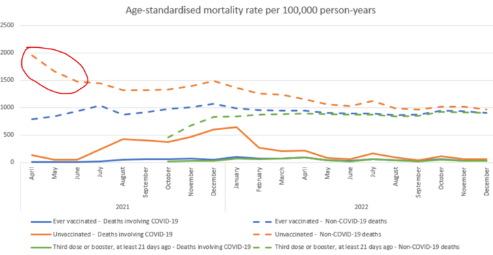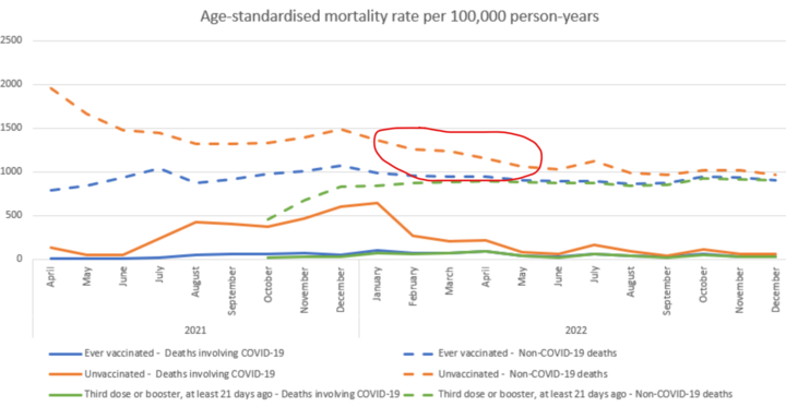 Dr. Sarah Caul from the ONS tweeted out a graph showing the age-standardised mortality rate (per 100,000 person-years) over 2021 and 2022 by vaccination status, split into Covid and non-Covid deaths.