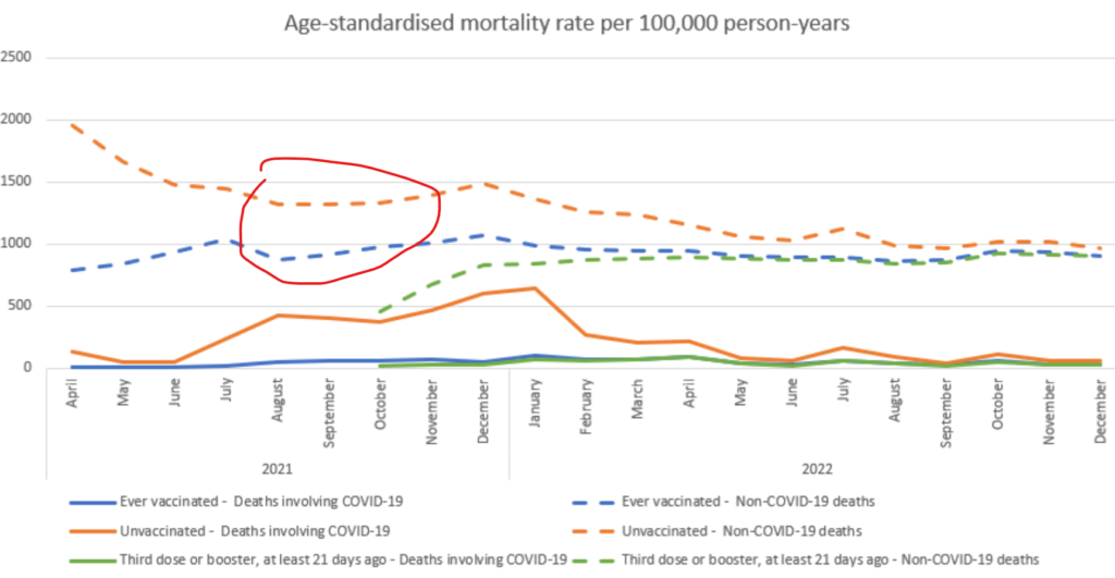 “The next thing to note is the drop in the non-Covid death rate in the unvaccinated in the first half of 2022, by around 30%. Why do the unvaccinated became much less likely to die over this short period? It is not explained…”