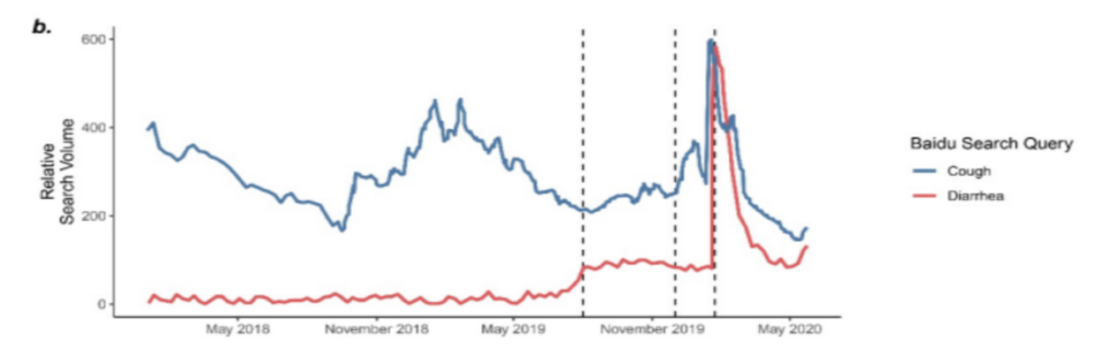 In China, a leaked Government report on early cases in Wuhan identified nine patients hospitalised in November 2019 with what was later confirmed as COVID-19 (the earliest symptom onset date was November 17th), though these have never been added to the official total. A study also claimed to find no neutralising antibodies in Wuhan blood donors in September to December 2019, though it’s unclear how reliable this is. ‘Baidu’ internet searches in Wuhan for ‘cough’ did not rise until December (see below, top) and likewise there is no spike in influenza-like hospital admissions until December (bottom).