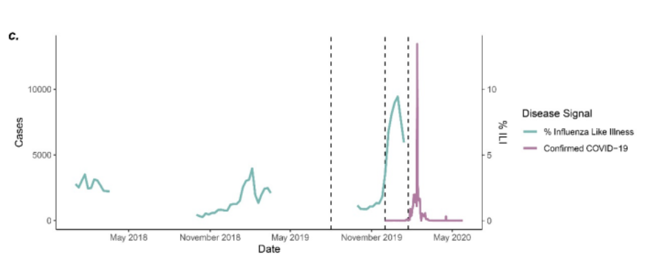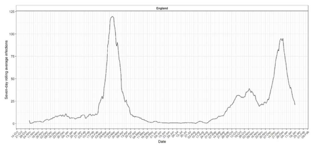 A notable rise in symptomatic illness can be seen from the end of November 2019 to a steady level that continues through the winter. The explosive outbreak of the first wave in late February 2020 is also clearly visible. This graph neatly illustrates how the virus can circulate for months at a low level (three months in this case), including through the winter flu season, before an explosive outbreak occurs, apparently out of the blue.