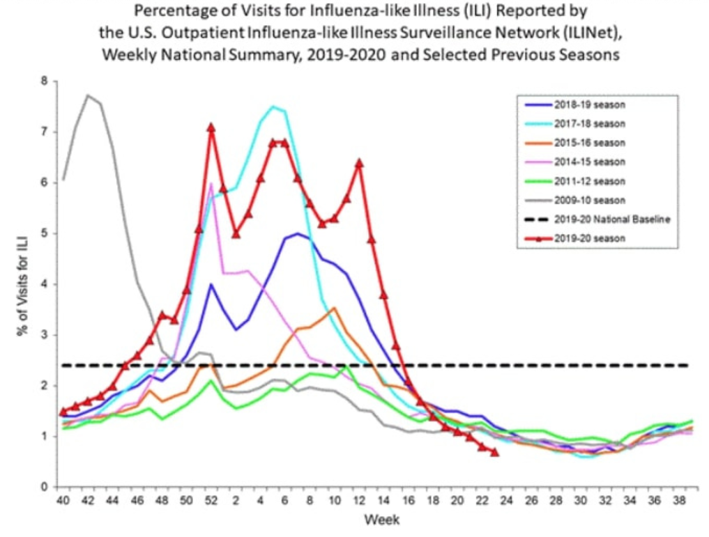 A chart of influenza-like illness incidence in the U.S. also shows no notable increase in symptomatic disease before November 2019 (see red line below; November is around weeks 44-48).