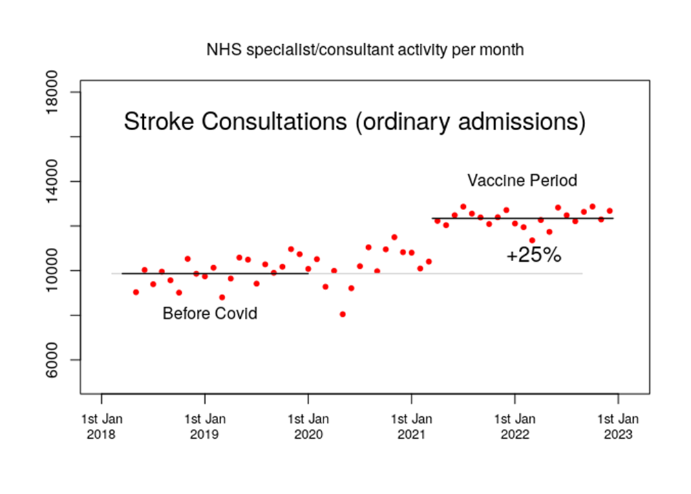 Hmm. The workload of stroke specialists appears to have suddenly increased in the U.K. by a very large factor just at the point where the vaccines were being rolled out in large numbers. As I recall the Government was very pleased with the speed at which it managed to vaccinate such large numbers of people over such a short period of time, so if there were a significant increased risk of stroke then an extremely rapid rise in stroke incidence would be exactly what you’d expect. Of course, this might just be coincidence, despite this strong temporal association with the vaccines…