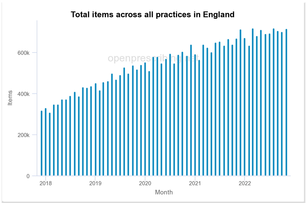 The data for prescriptions of general ‘blood-thinning’ drugs are a bit difficult to interpret, however, given the general increase in the use of these drugs in the community. The graph below shows the increase in prescriptions written for apixaban by GPs over the last few years.