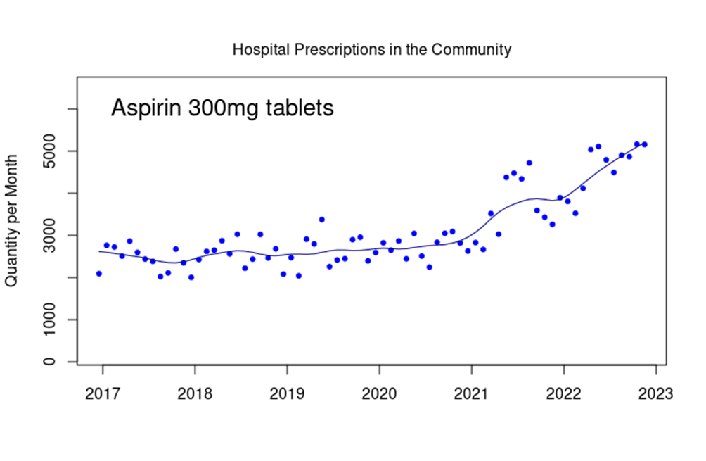 There is also a strange upwards trend in the prescription of aspirin (300mg) in hospitals for dispensing within normal pharmacies.