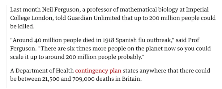 However, if the Health Security Agency is modelling bird flu, perhaps it should start by revisiting the 2005 models. In 2005 Neil Ferguson told the Guardian “that up to 200 million people could be killed”. The Department of Health considered anywhere up to 700,000 deaths could occur in the U.K.