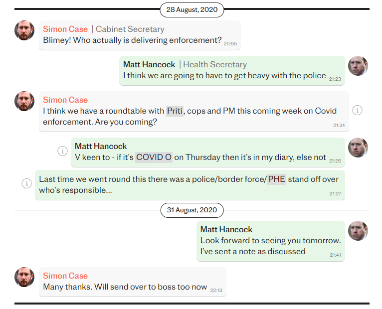 The messages also show ministers and officials celebrating police cracking down on Covid rule-breakers and the implementation of other hardline rules.