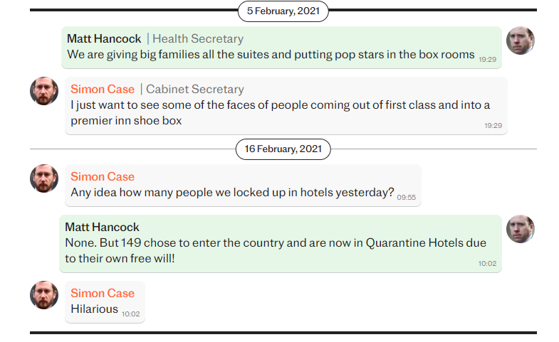 Mr. Case joked with Mr Hancock in February 2021 about the public being kept in quarantine hotels to avoid a fine.