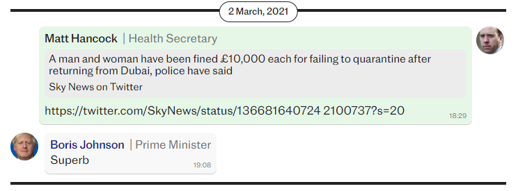The next month, as concern mounted about importing cases of the virus from abroad, Boris Johnson said it was “superb” that two people had been fined £10,000 for returning to Dubai without quarantining.