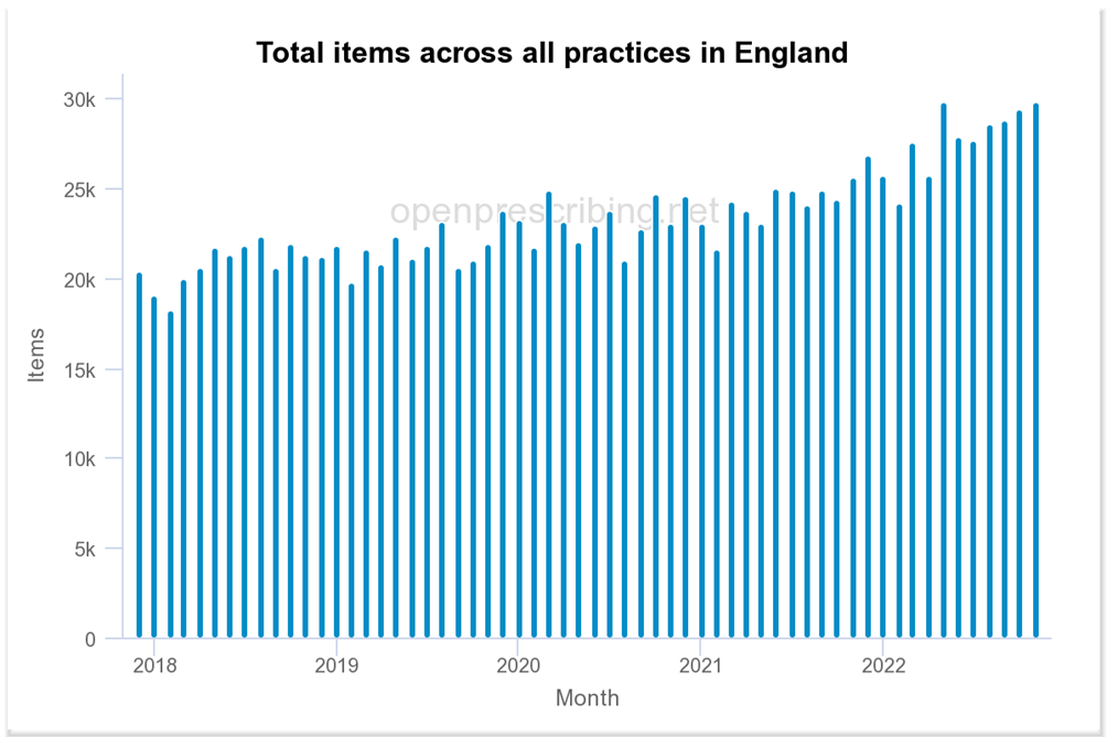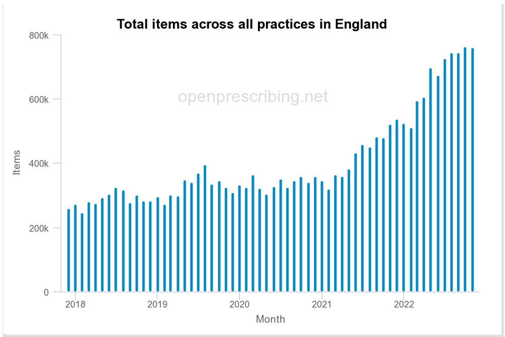The field of endocrinology is all to do with the way hormones in the body work. The chart above suggests that something significant appears to have happened over the past three years. Intrigued, I popped over to the OpenPrescribing website to see if there had been any significant change in the prescription of drugs related to endocrine function. However, examination of these data didn’t highlight any particular problem for common endocrine disorders such as those associated with impairment of the function of the thyroid gland.