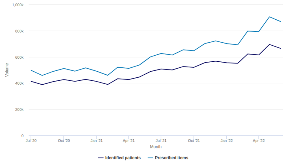 Has there been a significant rise in women suffering symptoms related to the menopause since the start of 2021? A document issued by the NHS last year on HRT activity in the NHS since 2015 suggests that there was indeed a significant rise in activity that occurred in spring 2021. Figure 2 from that document also indicates that this wasn’t simply more hormones being prescribed, but also that it was affecting substantially more women.
