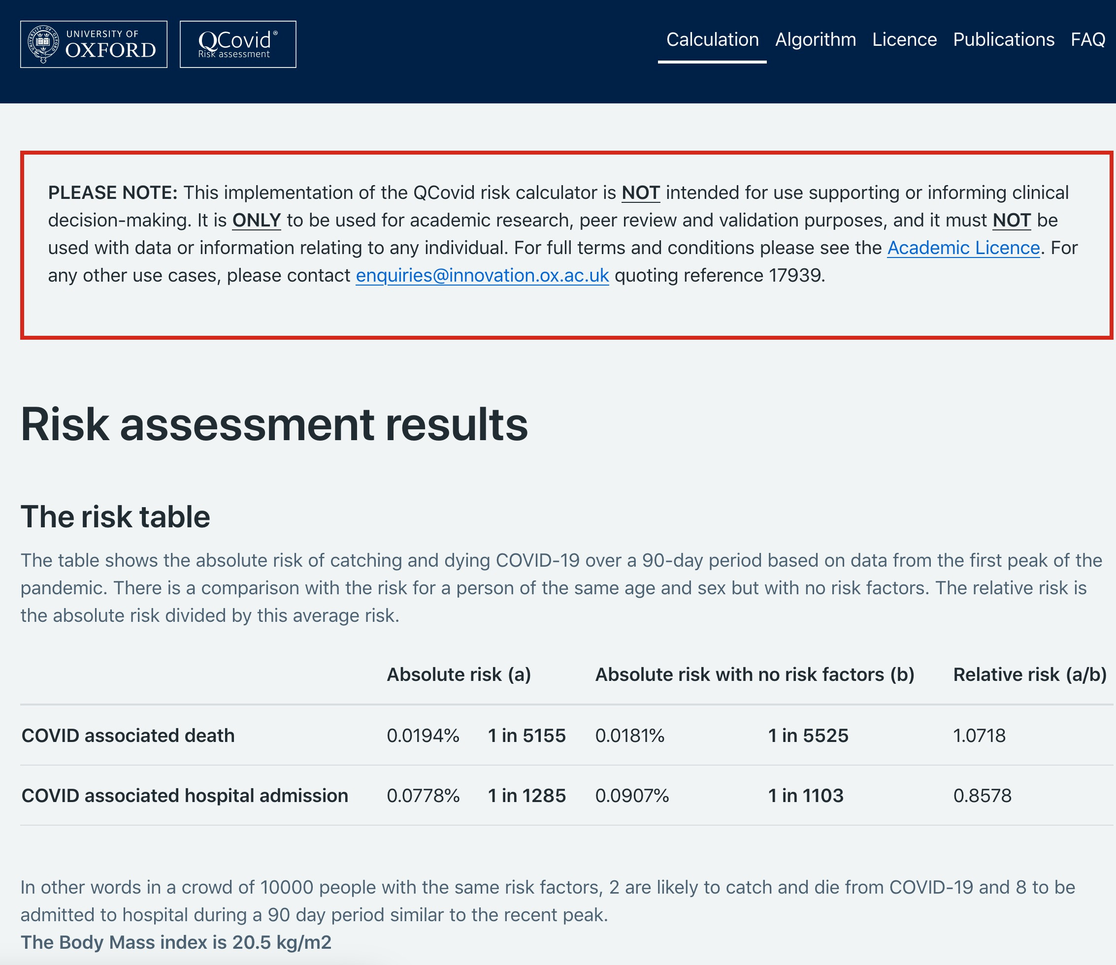Back in 2020, there was an Oxford University published gadget that allowed one to work out the risks based on a range of different factors. I used it from time to time, and the real risk numbers were tiny. Here’s what the output looked like in early 2021.