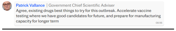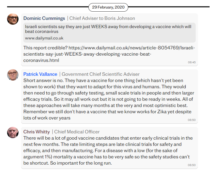 Chief Scientist Patrick Vallance agreed with this advice and wrote that existing drugs should be relied on instead: “Agree, existing drugs best things to try for this outbreak. Accelerate vaccine testing where we have good candidates for future, and prepare for manufacturing capacity for longer term.”