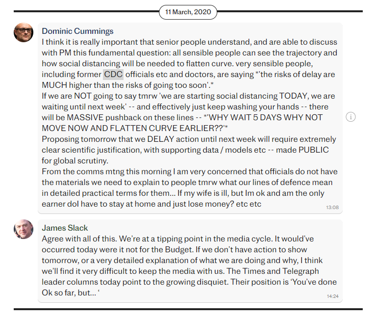 By March 11th Boris Johnson’s Chief Adviser Dominic Cummings was stressing how difficult it was to continue to hold the liberal line – and not very subtly implying he agreed with the critics.