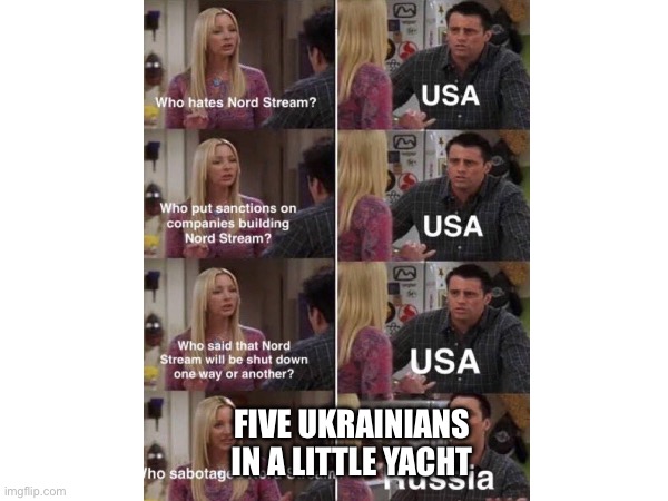 On the one hand, it certainly makes sense. Indeed, I’ve been arguing for months that Ukraine is the most likely culprit. (I had been envisioning a Government-sanctioned op, and while yesterday’s reports insist Zelensky was not involved, the New York Times says that those responsible might have “connections to the Ukrainian Government or its security services”).