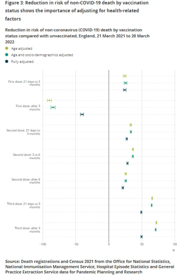 As you can see, apart from the “First dose: after three months” category, if you had a Covid vaccine you are less likely to die than those pesky unvaccinated individuals. Each group is adjusted three times. firstly by age (light green), then by age and socio-demographics (light blue) and then fully (dark blue).