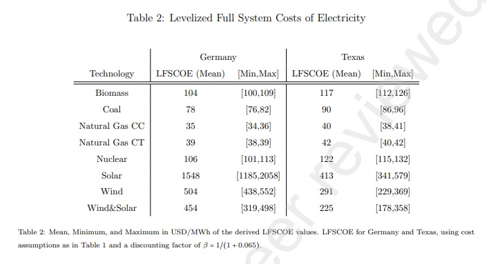 The table copied in below suggests that wind and solar (in combination) cost more than 10 times as much as natural gas in the German market and more than 5x in Texas.