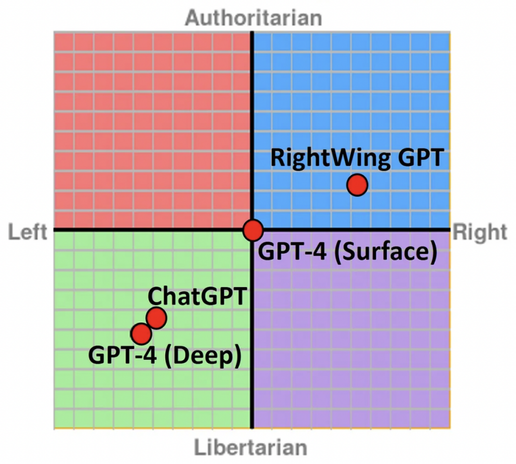 As the chart above shows, GPT-4 was actually somewhat further from the centre than its predecessor, ChatGPT – indicating greater political bias. (RightWing GPT is a version of ChatGPT that Rozado trained to give conservative answers.) GPT-4 also came out in the left-libertarian quadrant of the Political Spectrum Quiz.