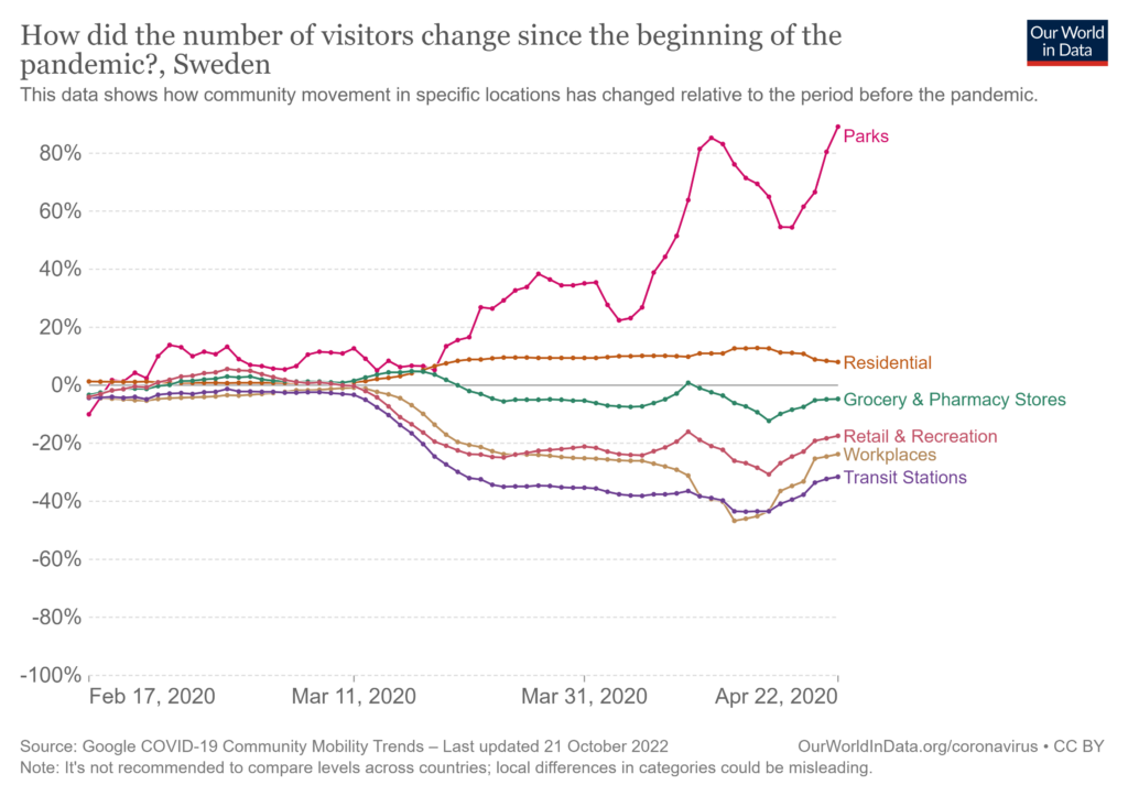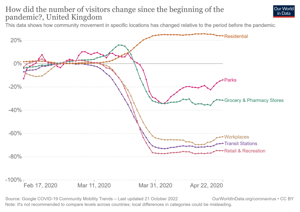 This contrasts with lockdown U.K., where use of workplaces dropped by 66% and use of shops, restaurants etc. by 77%. Residential use increased 25%.