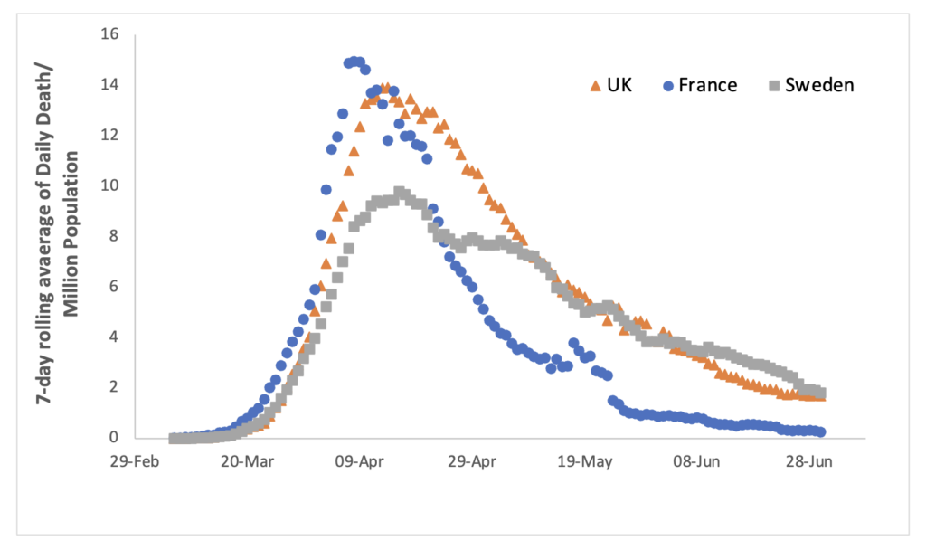The first lockdown, or at least the first month of it, can be forgiven. There was much uncertainty, and the NHS was ill-prepared. A pause was defensible. Yet it was soon clear that the first COVID wave was subsiding in lockdown-free Sweden as much as in the U.K. and in countries with stricter regimes, such as France (see below).