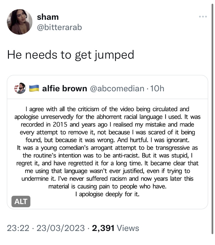 An old video emerged of Alfie trying to ridicule both racism and virtue signalling in a standup routine in which he uses the n-word. Not something I’d have done, and not his best work, but also not that surprising given that transgressive comedy has always been Alfie’s style.