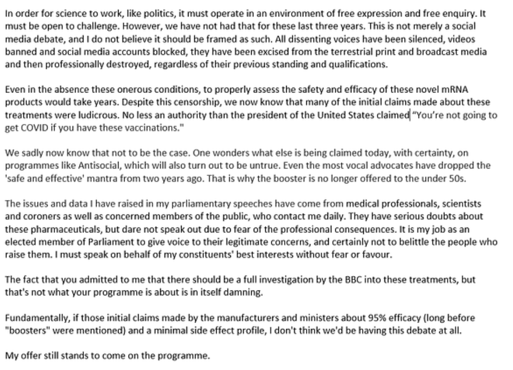 The one person who should have been present to defend himself, but was curiously denied the opportunity, was Andrew Bridgen himself, who tweeted: “I was contacted by BBC Radio 4’s AntiSocial for a programme going out right now. They declined my offer to come on, even though, or perhaps because, they were talking about me. I sent them this statement instead.”