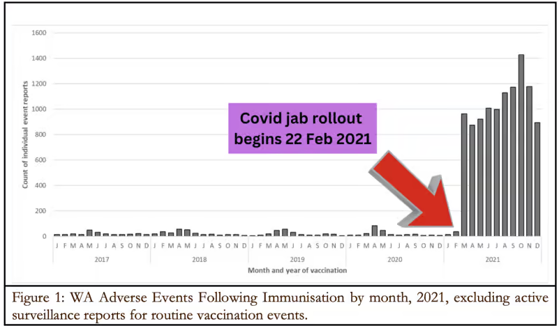 An analysis of the situation in Western Australia (WA) is especially interesting, because although four million vaccine doses were administered in 2021, border closures to interstate and international travel were zealously enforced to protect the state as an infection-free-zone. Subsequent adverse events therefore cannot be attributed to Covid.