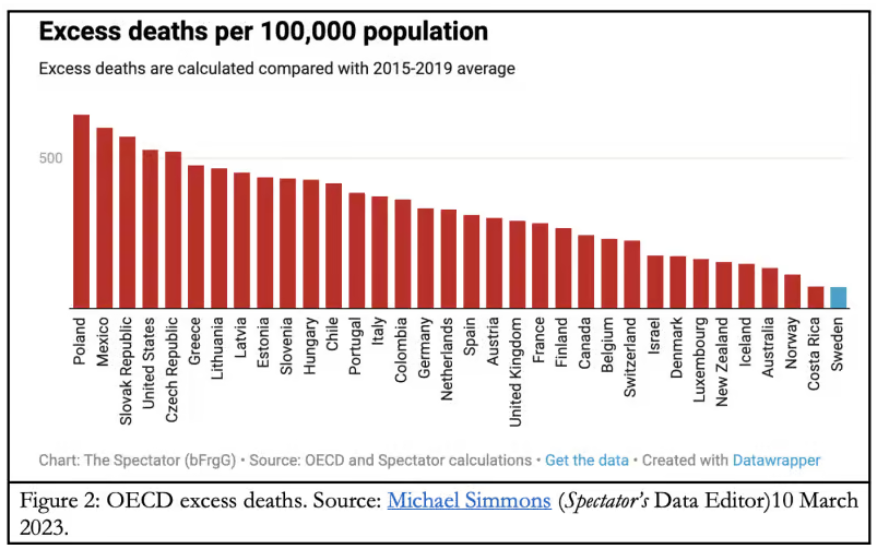 The lockdown harms are showing up in excess death counts, job losses, supply chains chaos and rising costs of living. This may get worse in the next two to five years before it begins to normalise. Sweden appears to be a standout in bucking this trend (Figure 2).