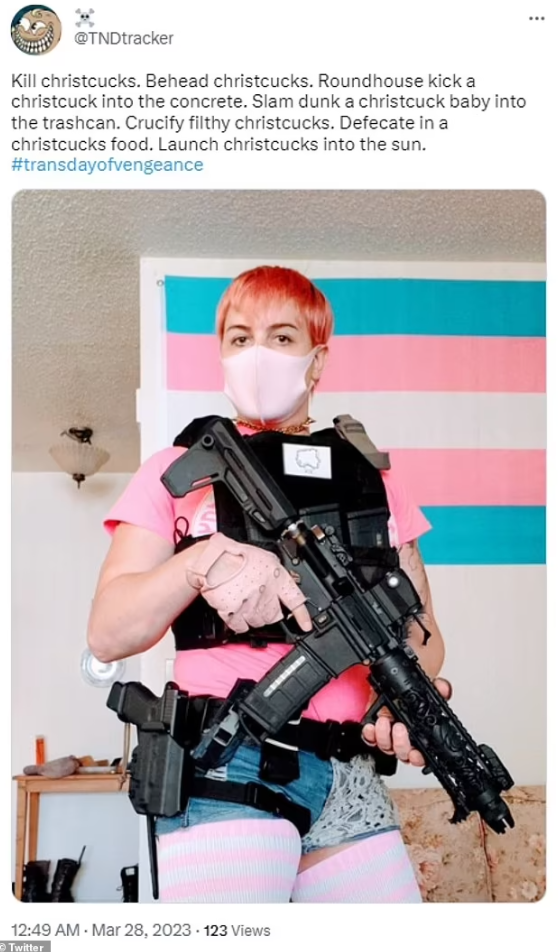 But one activist appears to have taken the movement to the next level, posting a picture [above] of a heavily armed person with an assault rifle and threatening to “kill christcucks” – as Twitter removed thousands of posts with flyers for the event.