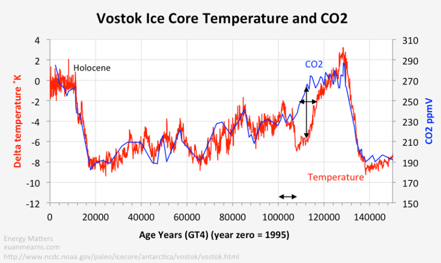 A seminal science paper in 1999 (Petit et al.) concluded that CO2 lagged temperature during the onset of glaciation by several thousands of years. The above graph shows that over many periods, particularly during the current Holocene, temperature and CO2 levels are not in general lockstep. A more plausible observation might be that naturally rising temperatures lead to higher levels of CO2 as gas is released from across the Earth’s surface.