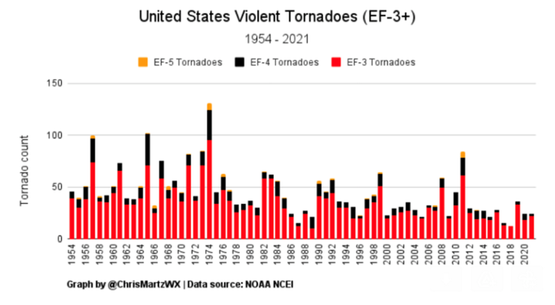Of course Francis is in good company in claiming black is white so far as U.S. tornadoes are concerned. Penn State meteorologist Michael Mann claims that the latest science “indicates that we can expect more of these huge (tornado) outbreaks because of human-caused climate change”, while Jennifer Francis, a scientist at Woodwell Climate Research Center, told the Guardian that climate change was “making some of the ingredients needed to create an outbreak like this more likely”.