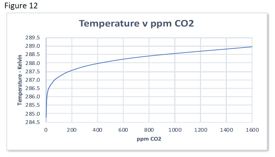 I don’t believe in the man-made catastrophic climate change narrative, but I think we should acknowledge that man does have some impact on the climate, mainly through the greenhouse effect. My understanding is that any contribution man has made through the greenhouse effect is pretty much at saturation point i.e. increases in atmospheric CO2 above the current level of around 410 parts per million will have negligible impact (see the attached diagram, which indicates a rise in CO2 from 400 ppm to 800 ppm increases temp by 0.4C and 400 to 1600 ppm results in 1C).