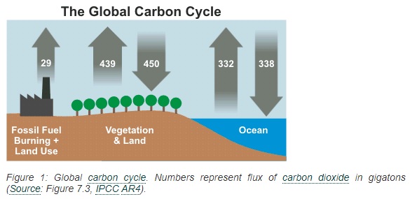 I also think it is disingenuous of us to talk of man’s share of CO2 emissions, since Gaia both emits (land, volcanoes, oceans) and absorbs (vegetation, oceans) CO2. So, while man’s share of emissions may be less than 5%, it will be a much higher % of net emissions (see attached diagram).