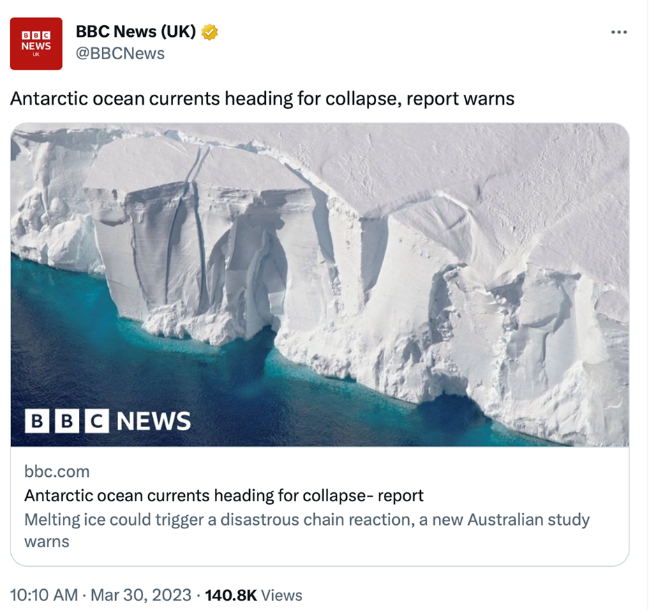 The BBC recently ran a story claiming that the Antarctic ocean currents were heading for collapse, and to drive home the scare there was even a reference to the 2004 climate disaster film, The Day After Tomorrow. Rapidly melting Antarctic ice was reported to be causing a dramatic slowdown in deep ocean currents, “and could have a disastrous effect on the climate”. Like most of these fanciful scare stories, “could” is doing a lot of the heavy lifting work. But alas, missing from this Net Zero-promoting, model-inventing Armageddon tall tale was a note that the Antarctica ice cap appears to be in balance, and is not actually melting.