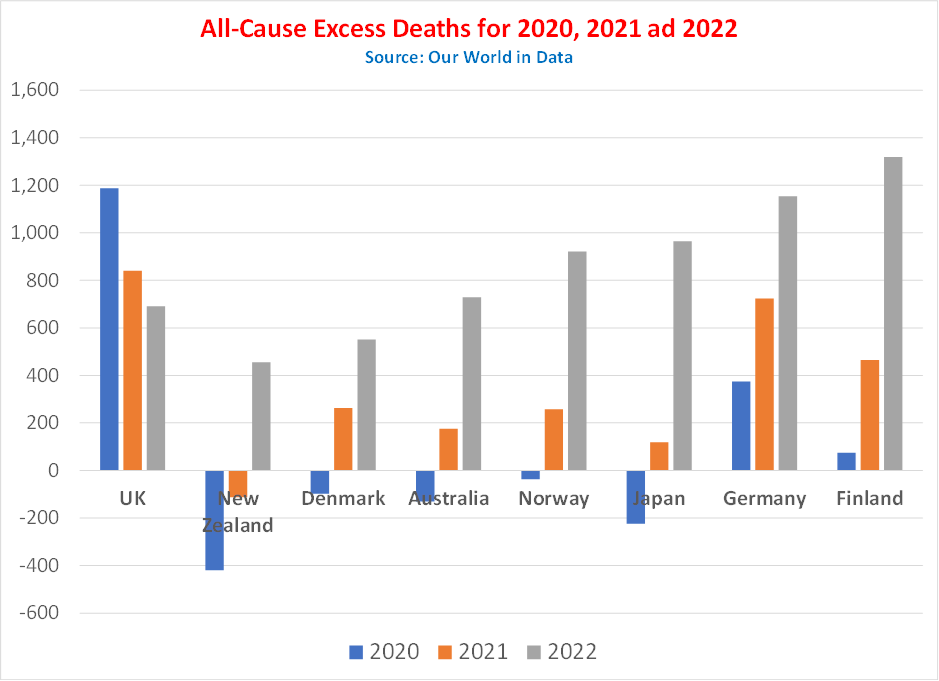 The amazing thing to me is that in each of these countries their populations appeared to feel safe in 2022 whereas they lived in fear in 2020. They appear to believe that their salvation is down to being injected multiple times by mRNA vaccines. Looking at Figure 3 you can understand that people in the U.K. could be persuaded to go along with the narrative; an unprecedented pandemic is defeated by a combination of novel NPIs and novel vaccines. High levels of excess deaths in 2020 subsided in 2021 and further still in 2022; it all seems to fit the narrative. But how does that work in those other countries where the rate of excess deaths keep rising?