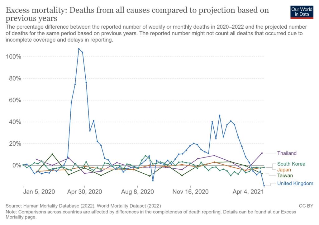 Putting this down to whatever each country did, when Japan did none of them while Western countries found none of them worked, makes no sense, and was usually based at some level on the silly idea that East Asians are just better at this kind of thing than Westerners. The more logical conclusion is that East Asia just wasn’t very susceptible to the initial strains, for whatever reason (save for the isolated outbreaks in Wuhan in January and Daegu, South Korea, in February). After all, once Delta and especially Omicron came along, these countries saw substantial waves, though their responses hadn’t changed.