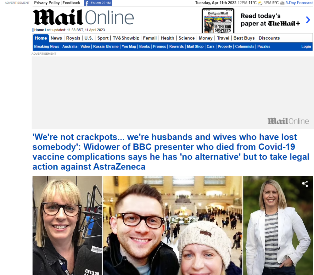I wish him and doubtless many others to come every success. It will be interesting to see how the (at the moment ) nobbled Judiciary get AZ/HMG off the hook on this one. “It was a new and novel pathogen which would kill millions of people eg 50,000 plus in the UK alone .No one had any pre existing immunity. It was imperative a vaccine had to be developed as quickly as possible.” That may be a defence to a negligence claim, but this sort of claim is a new one on me. Either way it will take decades to sort. Think Bigtobacco… That said, I wonder where the likes of Tim Davie stand. He’s responsible for the BBC disinformation unit and has said/admitted on many occasions that his job is to prevent the spread of disinformation. But, he also owes a duty of care to his employees…. Maybe this poor lady and many others would still be alive today had the BBC done its job properly ie allowed proper debate between relevant experts as to the benefits/harms of vaccines as weighed against the danger ofcovid. In my world, the heads of the likes of AZ, Pfizer,etc. and Davie, Blair… Read more »