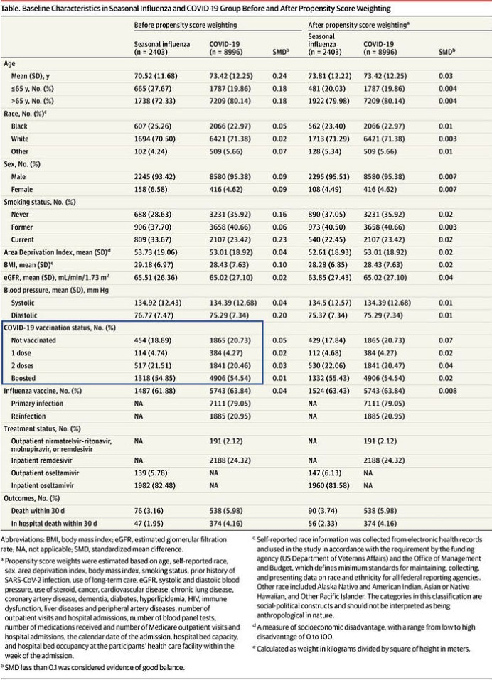 Did Covid vaccines reduce infections? Although the design was a classical retrospective cohort, the baseline data in the first table may be viewed as data from a hospital-based case-control study. (I cannot get into a technical explanation of ‘propensity score weighting’, but it can be ignored for a basic case-control analysis.)