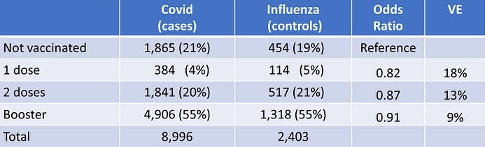 Interestingly, we may also view influenza patients as cases and Covid patients as controls and compare the distribution of flu vaccination status in the two groups. Check their table above. There is no meaningful association either.