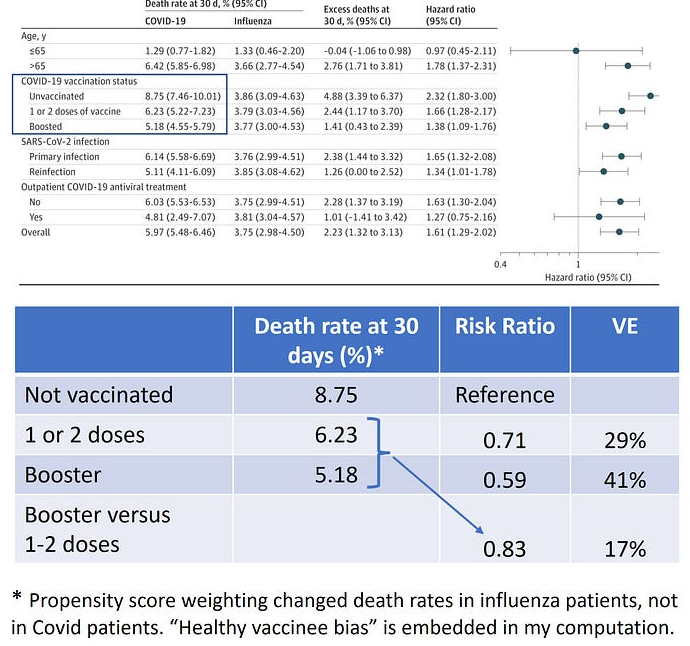 VE of 30% or 40% in the vulnerable population is far from ‘highly effective’, a perpetuated claim. The incremental benefit of booster vaccine (one or more doses, per supplementary material) was even smaller (risk ratio 0.83, VE 17%).