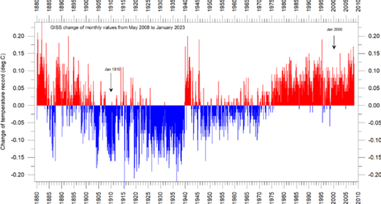Global warming is in short supply these days, and there is increasing interest in how the major surface temperature datasets keep the heating topped up in their published results. The GISS service is run by NASA and in his latest ‘State of the Climate 2022‘ report, Professor Ole Humlum notes that since January 2008, GISS increased the surface air temperature change between January 1910 to January 2000 from 0.45°C to 0.67°C, a boost of 49% over this period.
