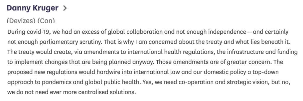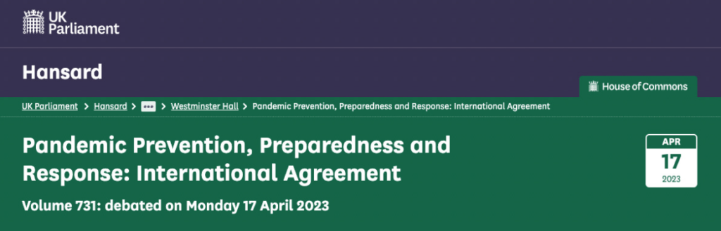 Yesterday in Westminster Hall, MPs debated the Pandemic Prevention, Preparedness and Response: International Agreement. Over 150,000 signed the petition to “not sign any WHO Pandemic Treaty unless it is approved via public referendum”. They don’t want the Government to commit to signing an international treaty unless it is approved through a public referendum.
