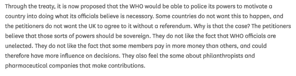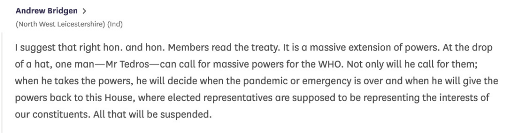 The WHO treaty is something no government should sign up to. It commits governments to follow WHO directives, by an undemocratic organisation funded and influence by big pharma and despicable organisations such as that controlled by Bill Gates. It would remove government’s rights to decide what action if any to take about health issues. Although our government got it wrong over Covid, that was in a large part due to the influence of the WHO. I listened to Andrew Bridgen’s contribution to the off-parliament debate, and although he rambled a bit he, drew attention to the issues that every one of our politicians should be voting against. Judging by the blank looks and lack of support from every one else there, it would be easy to assume our politicians are too thick to understand the dangers from this treaty if we sign up to it.