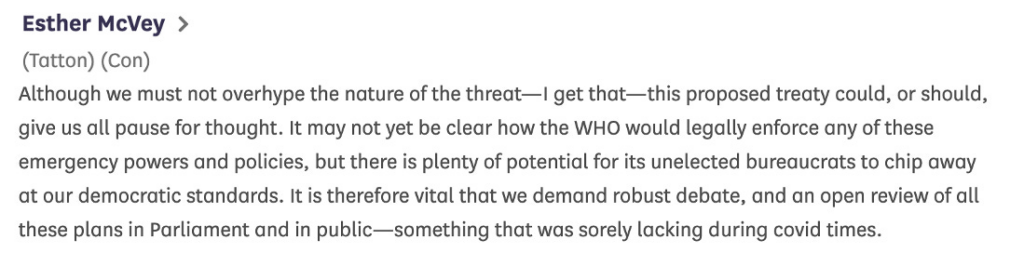 At the end of the Committee meeting we had:- Esther McVey “Can the Minister reassure my constituents who are concerned that the Government will concede sovereignty and hand power to WHO? Can she give reassurances that that will not happen?” Anne-Marie Trevelyan [Minister of State Foreign, Commonwealth and Development Office for Indo-Pacific] “Yes, absolutely I can. The speculation that somehow the instrument will undermine UK sovereignty and give WHO powers over national public health measures is simply not the case. I absolutely reassure both my right hon. Friend and my hon. Friend the Member for Hastings and Rye (Sally-Ann Hart), who raised a similar issue earlier, on behalf of all their constituents: that is not the case. The UK remains in control of any future domestic decisions about public health matters—such as domestic vaccination—that might be needed in any future pandemic that we may have to manage. Protecting those national sovereign rights is a distinct principle in the existing draft text. Other Members have also identified that as an important priority, so it is good to have the opportunity of this debate, brought about by those who have concerns, to restate that that is absolutely not under threat.” OK, I… Read more »