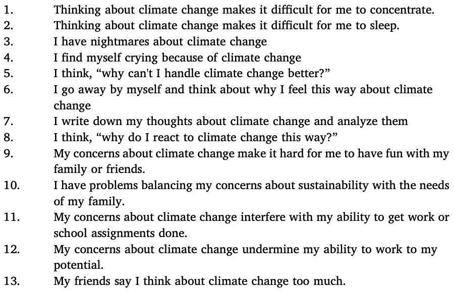 One month later, the researchers asked respondents to complete a 13-item measure of ‘climate anxiety’. (About 2,000 of them took part in both waves of the survey.) Items included ‘Thinking about climate change makes it difficult for me to concentrate’ and ‘I find myself crying because of climate change’. All 13 are listed below: