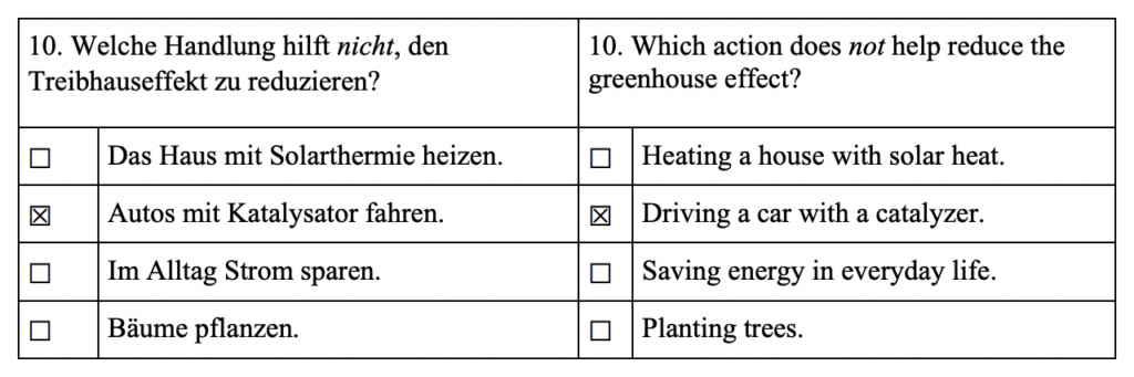 In October of 2022, the researchers gave an environmental knowledge test to a sample of about 2,300 Germans. The test comprised 35 multiple-choice items. (It is given in full in the Supplementary Material for this paper.) One of the items is shown below: