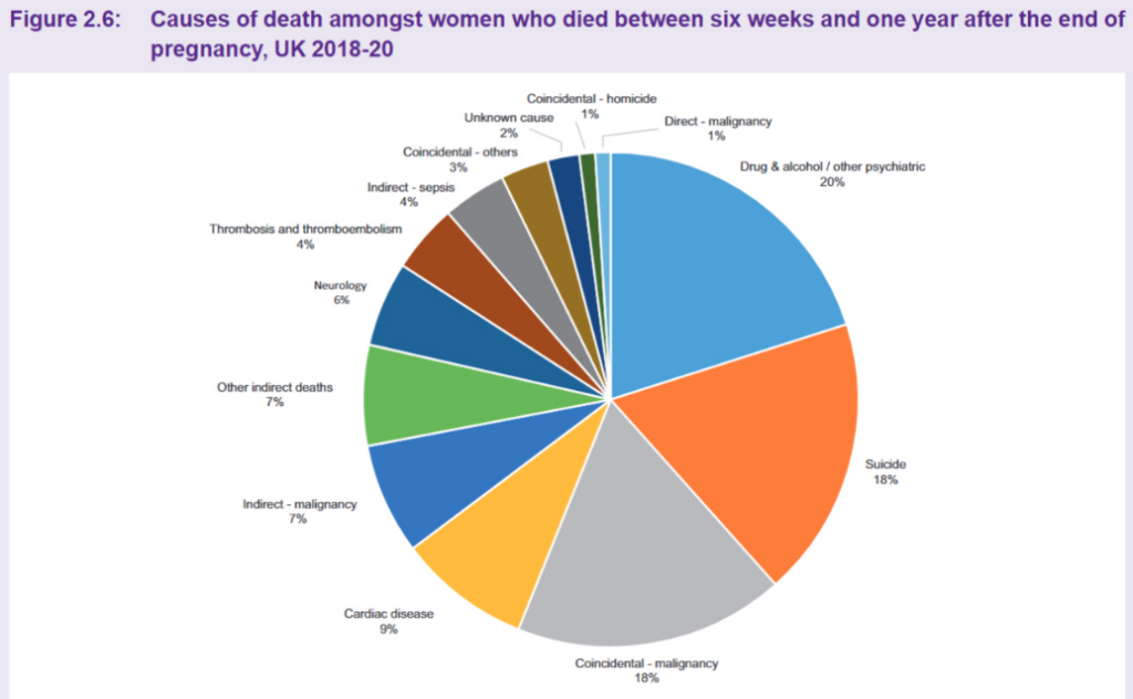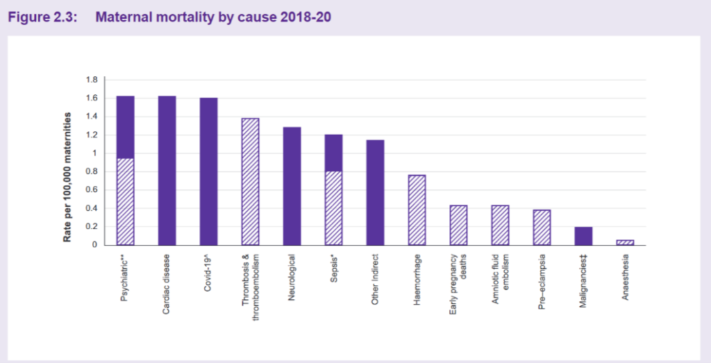 The first thing to note is that pregnant mothers are very safe, with a death rate of six per 100,000. Even taking a year-long period, and including indirect causes, deaths are extremely rare. Suicide and drugs/alcohol are prominent causes of the few deaths recorded, with cardiac disease and Covid of equal impact. (Hatched bars show direct causes, solid bars indirect causes.)