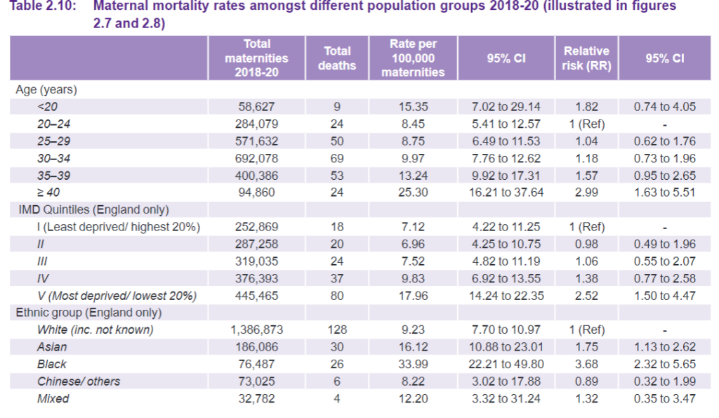 To put this report into context, as regards U.K. ‘Black Caribbean’ mothers, we are talking about three direct deaths and six indirect, so nine in all. ‘Black Africans’ (who probably have spent more of their lives in Africa), are five direct, eight indirect, 13 in all. Combine the two, eight direct, 14 indirect. Tiny numbers, but favouring indirect causes.