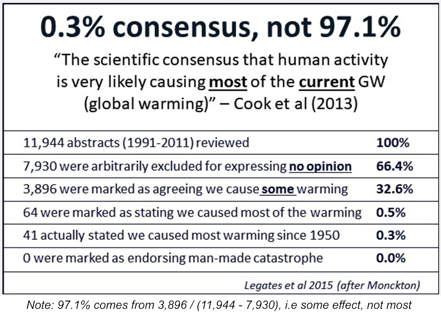 I refer to the so-called global consensus of 97% of scientists agreeing with anthropomorphic climate change.It’s 0.3%.