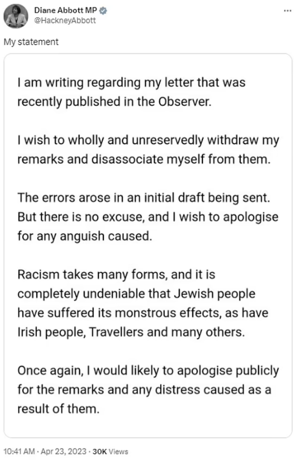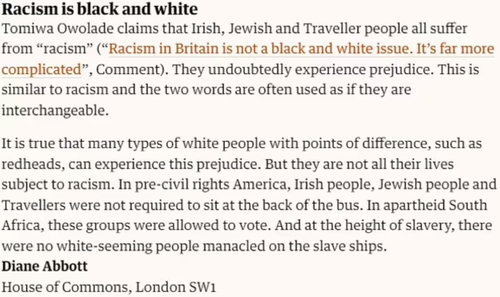 Ms. Abbott’s comments about Jews not suffering racism are reminiscent of comments by Whoopi Goldberg last year that the “Holocaust isn’t about race” because “these are two white groups of people”. There appears to be a strain of woke thought that sees racism as only applying to black people and not other racial or ethnic groups, or at least not to Jews and other “white-seeming people”.