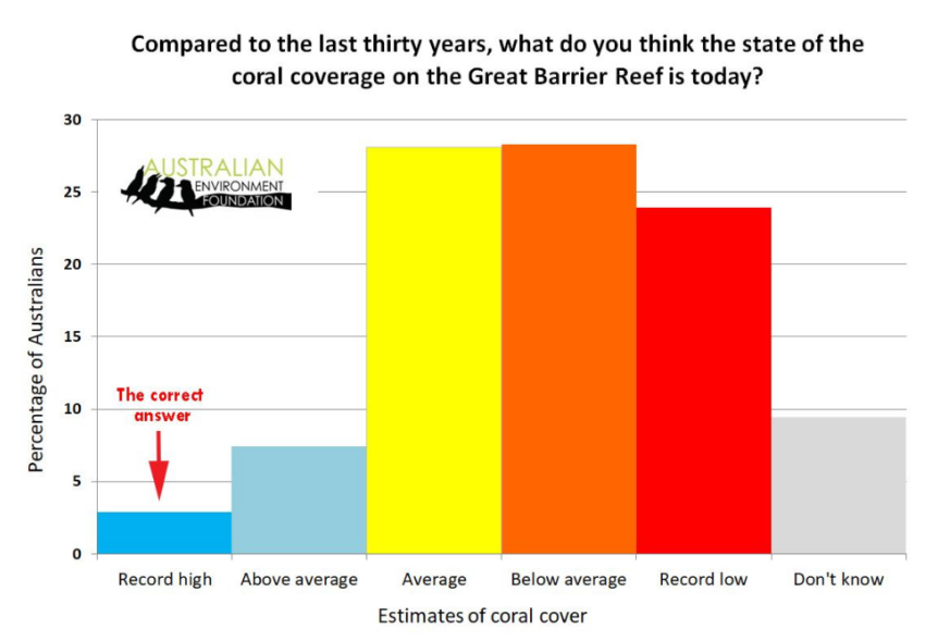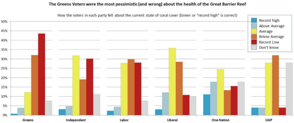 Three-quarters of sampled Australian green voters believe the Great Barrier Reef (GBR) is doing worse than usual, with 44% stating the coral is at a record low. Overall only 3% of all Australian voters knew that the coral was at a “record high” – the correct answer following two years of record growth that has broken all previous records. These findings are not a surprise, since the true picture on the reef has been downplayed, even hidden, by mainstream interested parties in the media and in science.